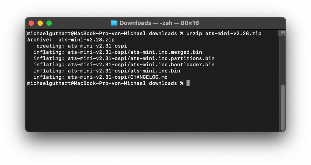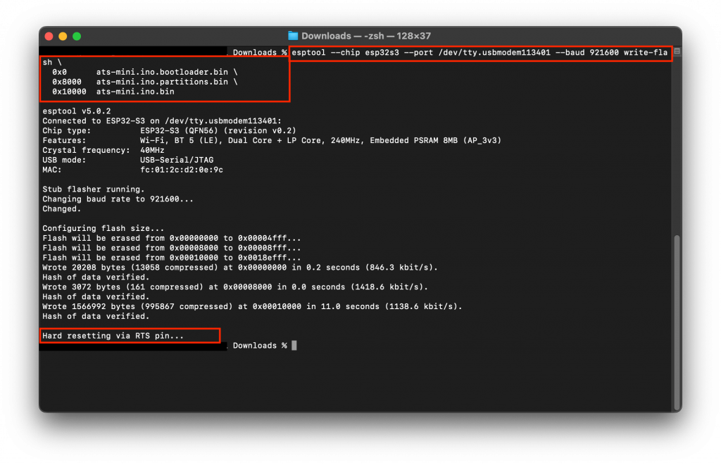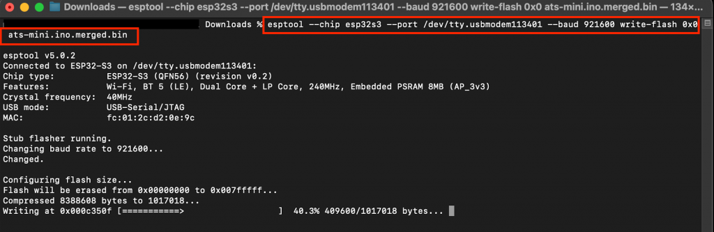 esptool –chip esp32s3 –port /dev/tty.usbmodem113401 –baud 921600 write-flash 0x0 ats-mini.ino.merged.bin
