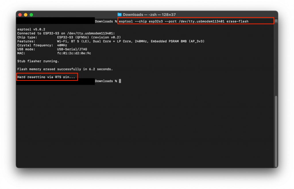 esptool –chip esp32s3 –port /dev/tty.usbmodem113401 erase-flash