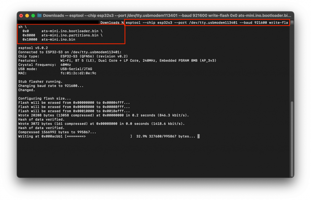 esptool –chip esp32s3 –port /dev/tty.usbmodem113401 –baud 921600 write-flash \