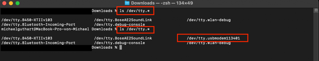 Nun wird erneut der Befehl zum Auslesen der USB-Ports abgeschickt und wir sehen, welcher Port dem Radio zugewiesen wurde: In dem Beispiel: /dev/tty.usbmodem113401