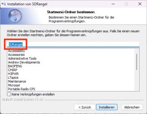 Im folgenden Schritt, wird festgelegt, wie SDR-Angel im Startmenü Ihres Windowsrechners angezeigt werden soll.
